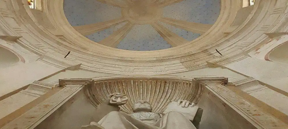 - Al entrar, puedes ver una cella con 16 columnas de orden toscano que se erige sobre una base escalonada y sobre el cual descansa el entablamento. Este último, tal como lo establece el modelo clásico, está formado por arquitrabe, friso y cornisa. El friso posee relieves y triglifos a modo de decoración que narran la vida de San Pedro.